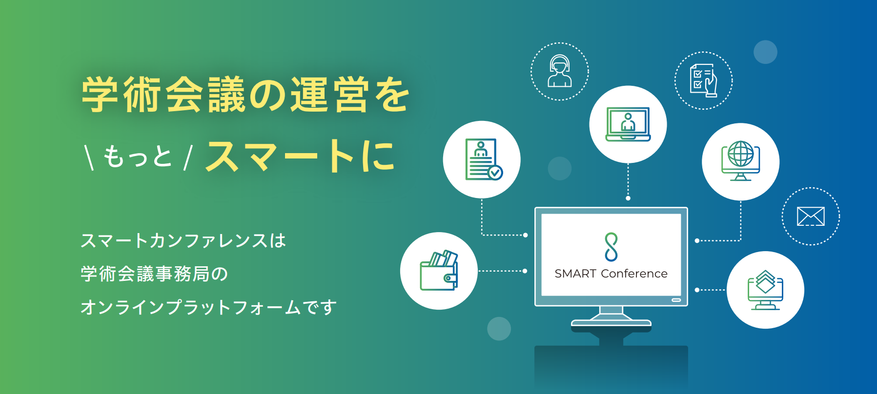 スマートカンファレンスは、学術会議事務局のオンラインプラットフォームです。デジタル化により極限まで業務を自動化することで、低コストを実現し、ホームページ公開まで最短1週間で運用開始が可能です。学会に必要な、参加者管理はもとより、参加登録・決済、座長講師依頼・管理、演題登録・査読、論文登録・査読、採択通知、プログラム一覧等の自動生成、オンライン会場やアーカイブ会場の設置、ホームページ制作まで、あらゆる機能が備わった学会運営のためのオンラインシステムです。